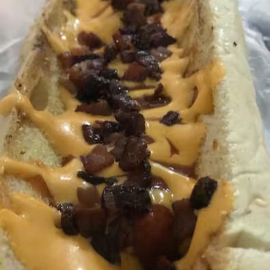 2 salsichas, cheddar e mais bacon, servido em 2 pães de cachorro quente