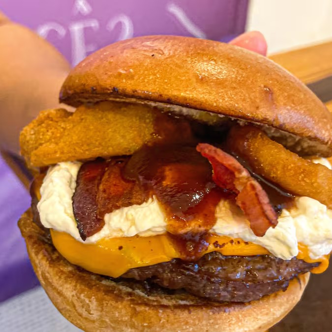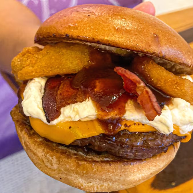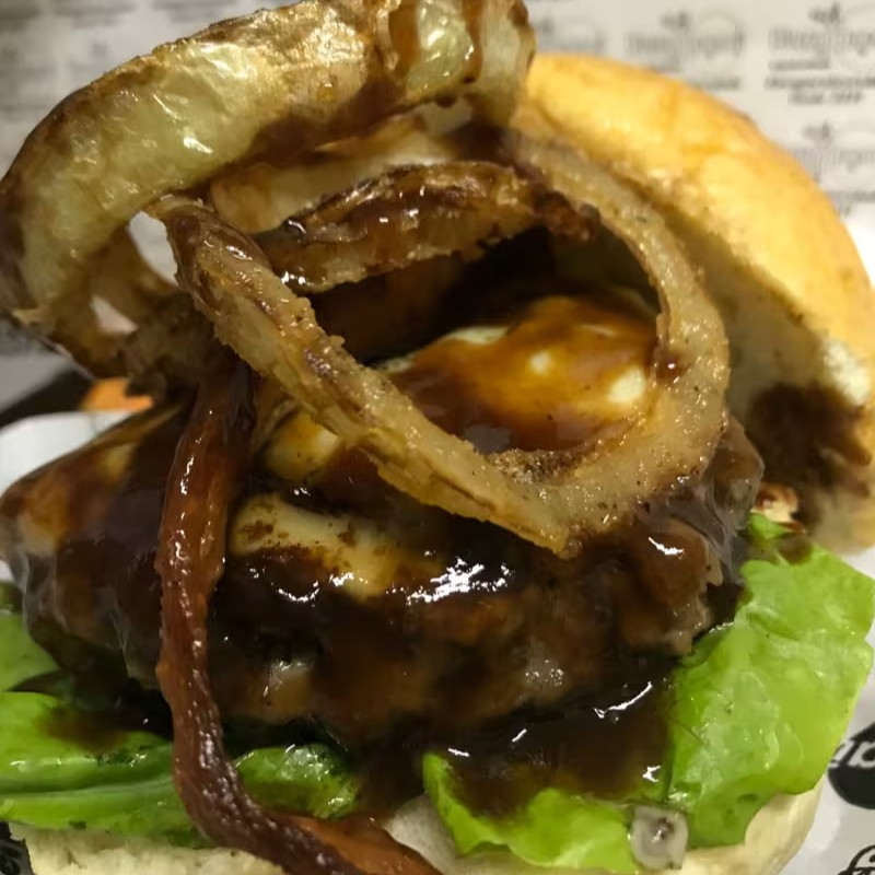 Pão tradicional de hambúrguer, blend bovino de 120g, duas fatias de queijo cheddar Vigor, duas fatias de bacon, cream cheese maçaricado, 2 onion rings empanadas na casa e pra finalizar, nosso delicioso molho barbecue.