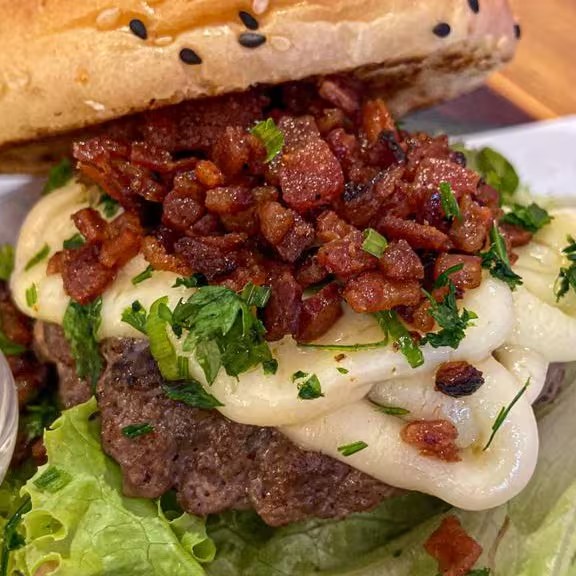 Pão tradicional da casa, alface, tomate, cebola e bacon bites caramelizados, cream cheese maçaricado, hambúrguer caseiro com 180g de blend angus.