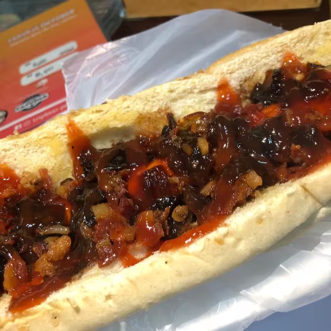 2 salsichas na chapa, molho sweet chilli (agridoce apimentado) cebola caramelizada, bacon caramelizado e batata palha, servido em 2 pães de cachorro quente