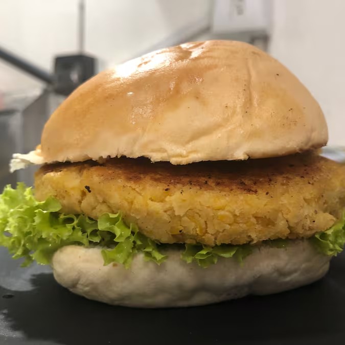 Pão tradicional da casa, alface, tomate, cebola , burguer vegetariano feito com grão de bico com 200 gr e queijo derretido