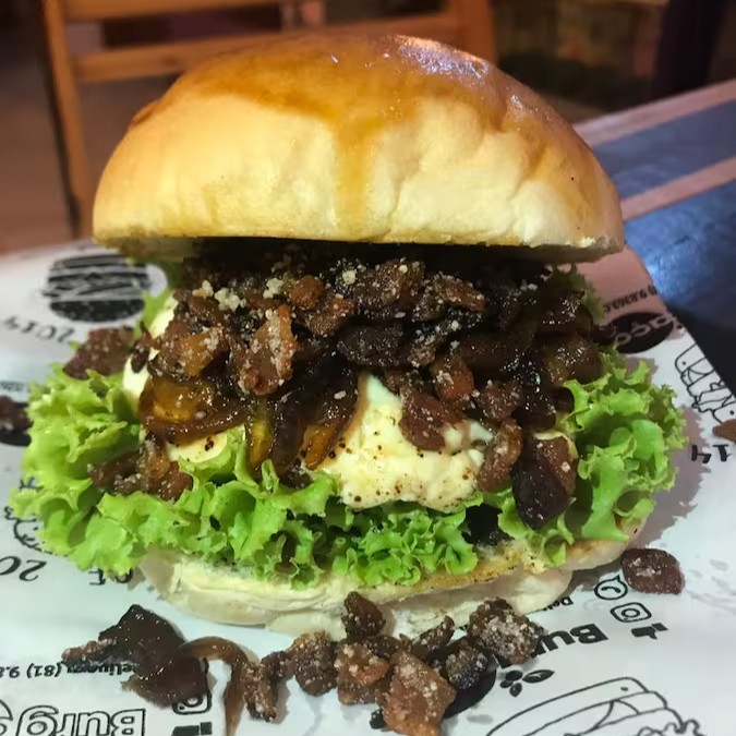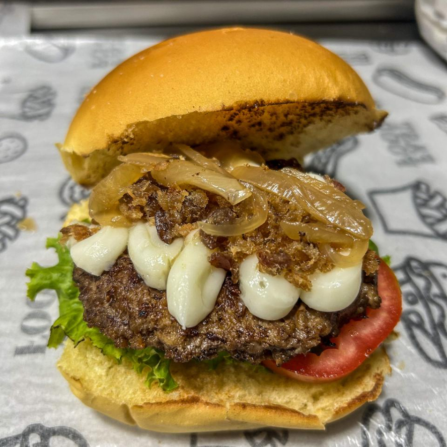 Pão bola, burger de 100g, alface, requeijão cremoso, bacon bits (farofa de bacon), cebola caramelizada, tomate e alface. Top, visse?