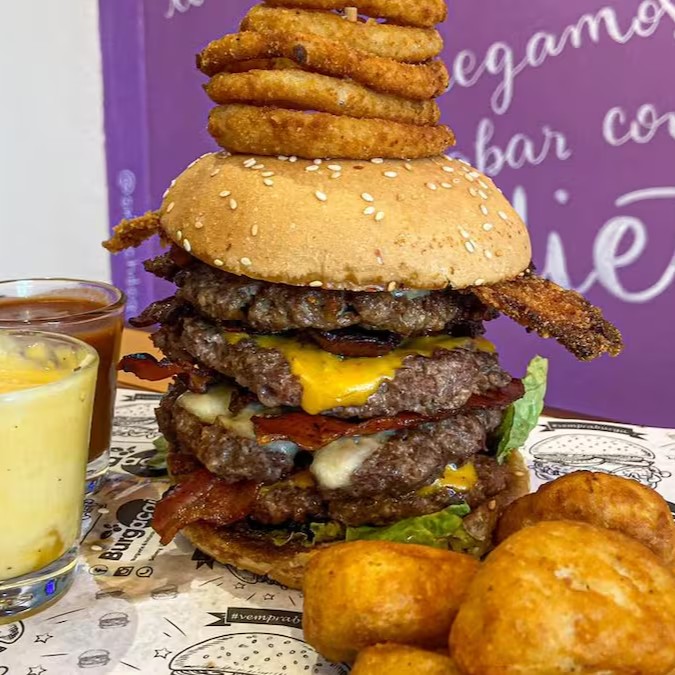 Burguer do Festival Comida Ogra 2022! Pão bola tradicional com gergelim, 4 blends bovinos de 120g, 2 fatias queijo cheddar, 2 fatias de queijo muçarela, 6 fatias de bacon, 1 bacon empanado na casa, 5 onion rings empanadas na casa e 5 Burga Nuggets. Acompanha os molhos tradicional da casa e nosso Burga Red, a base de catchup artesanal.