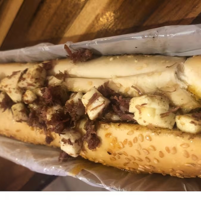 160g de blend bovino, charque desfiada e queijo coalho, servido num pão com gergelim
