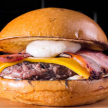 Burgão de 160g, 2 fatias de queijo cheddar, a melhor maionese do mundo, fatias de bacon crocante, em um pão brioche top das galáxias.