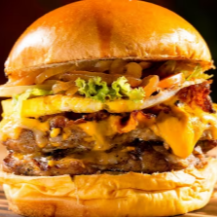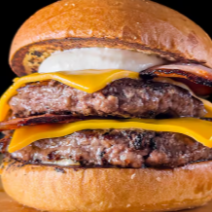 Para quem come muito e gosta de carne. Dois Burgões de 160g, 4 fatias de queijo cheddar, a melhor maionese do mundo, bacon, cebola caramelizada, em um pão brioche top das galáxias.