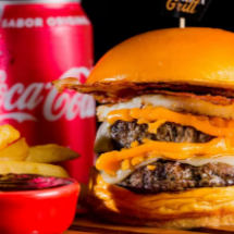 Pão brioche,2 carne bovina de 80g, queijo cheddar, fatias de bacon e maionese Burger Grill.