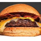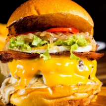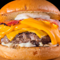 Burgão de 160g, 2 fatias de queijo cheddar, a melhor maionese do mundo, bacon e mais molho cheddar cremoso para se melar todo, em um pão brioche top das galáxias.