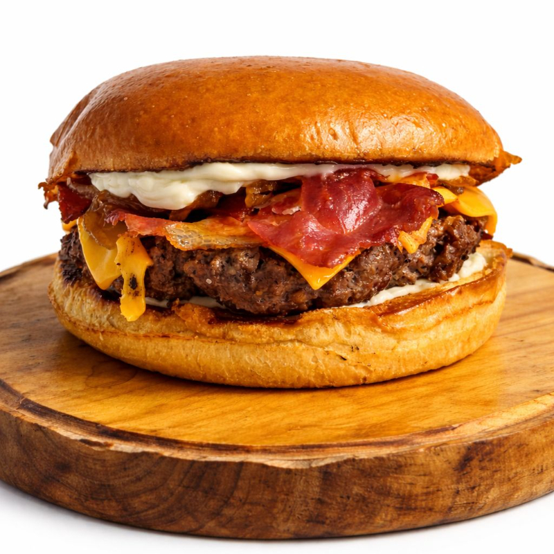 Pão brioche, blend bovino 150g, queijo cheddar, bacon crocante, cebola caramelizada e maionese da casa.