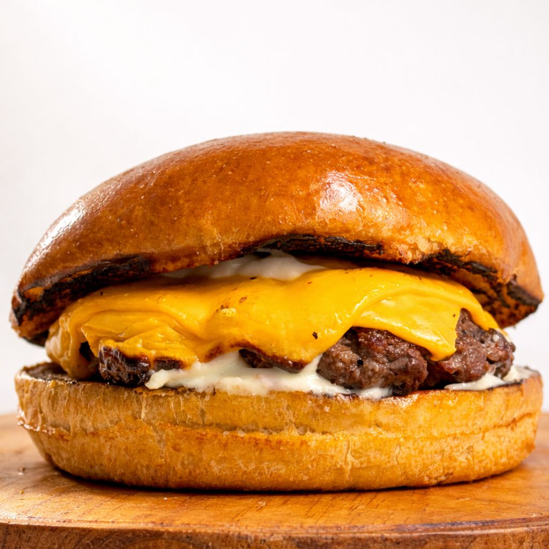 Pão brioche, blend bovino 150g, queijo cheddar, e maionese da casa.