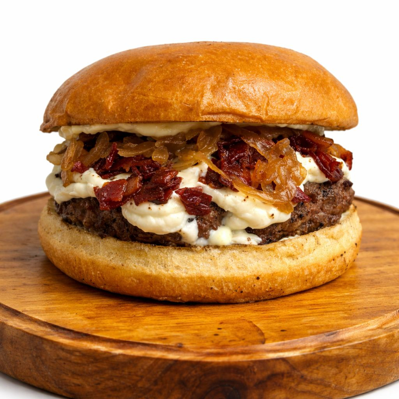 Pão brioche, blend bovino 150g, cream cheese, bacon crocante, cebola caramelizada e maionese da casa.