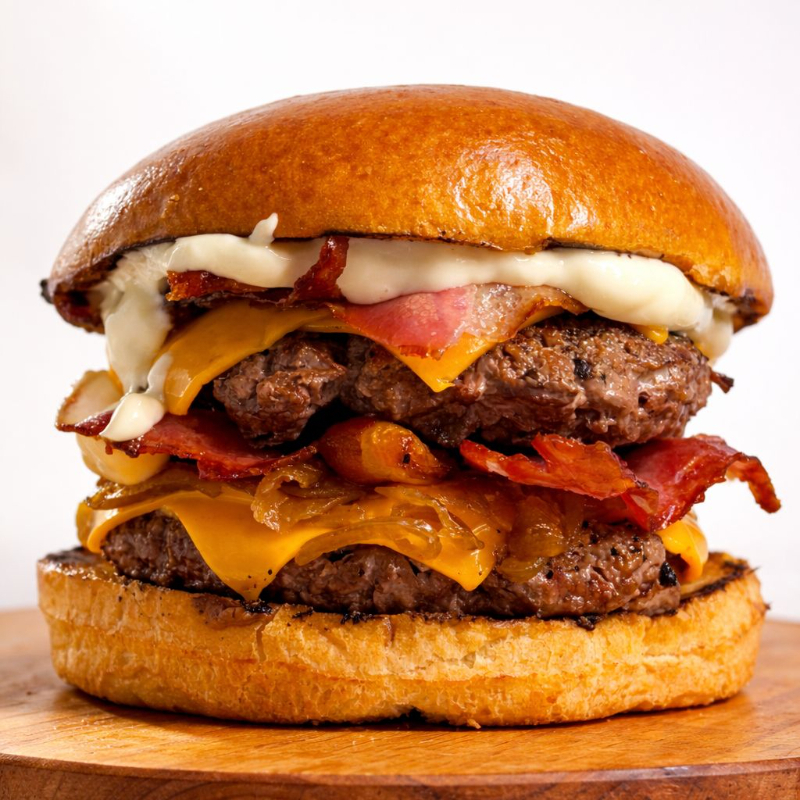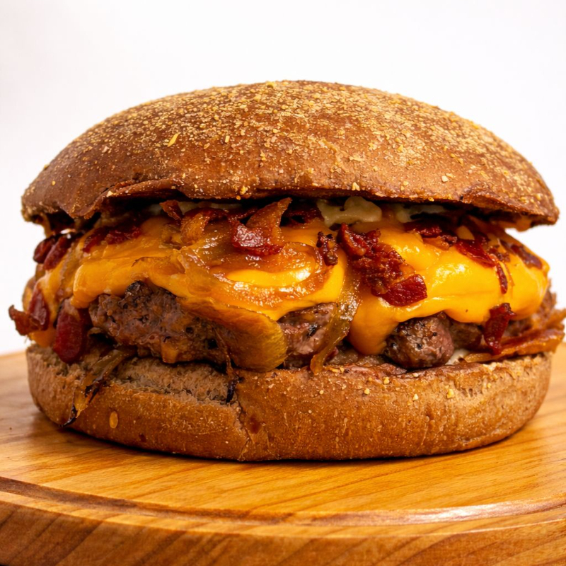 Pão brioche, 2 blend bovino 150g, queijo cheddar, bacon crocante, cebola caramelizada, mel e maionese da casa.