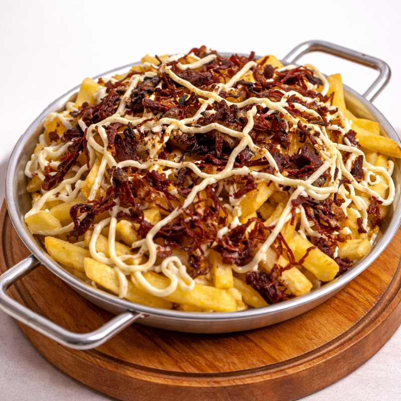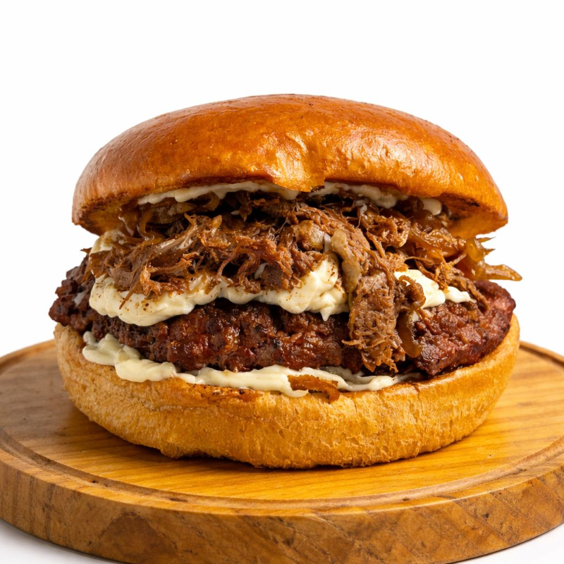Pão brioche, blend bovino 150g, costela desfiada, cream cheese, cebola caramelizada e maionese da casa.