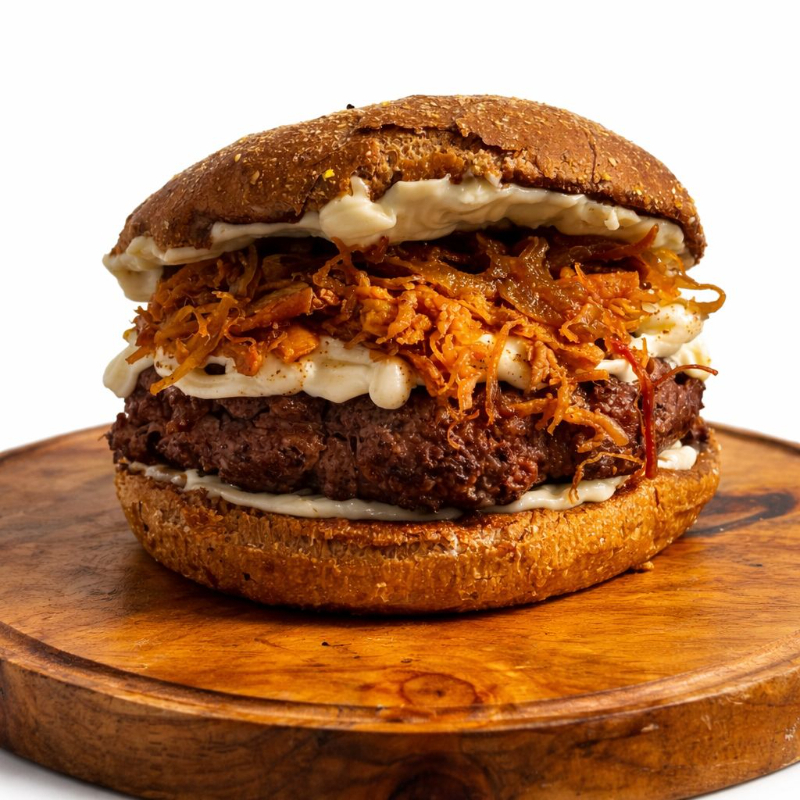 Pão brioche, blend bovino 150g, charque desfiada, queijo coalho com mel e maionese da casa.
