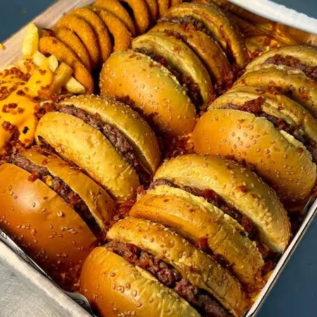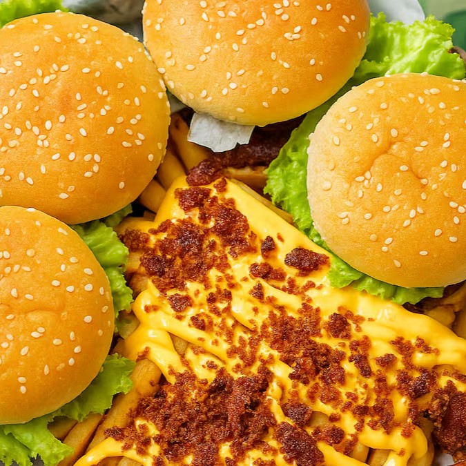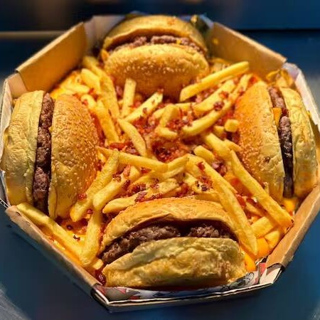 “5 Burguer's artesanais suculentos + batata frita turbinada com cheddar cremoso, bacon crocante.. Combo perfeito pra dividir (ou não ).