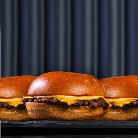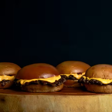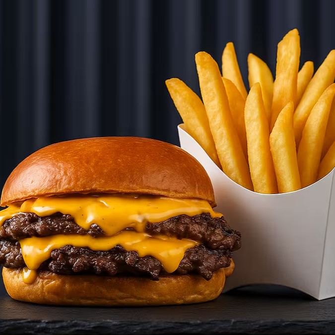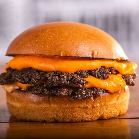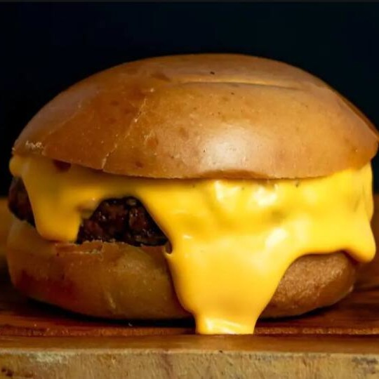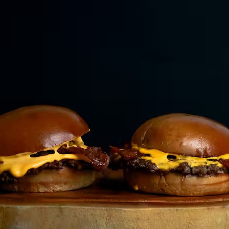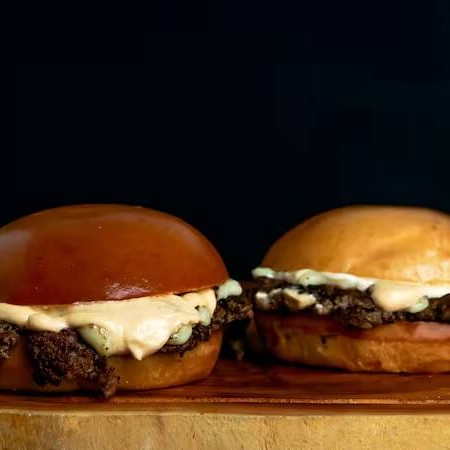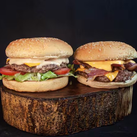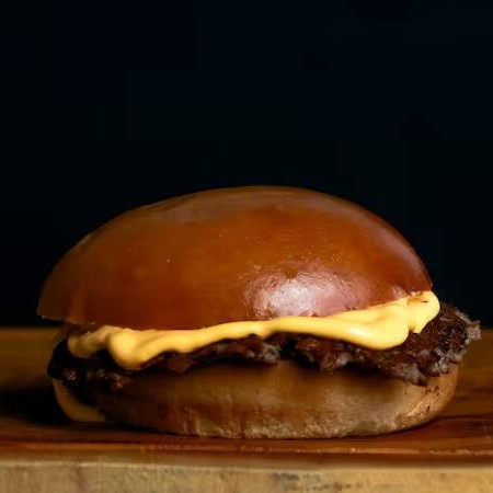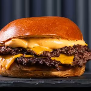 Pão brioche selado na manteiga, maionese da casa, 2 blends80g (cada) fraldinha e queijo cheddar cremoso.