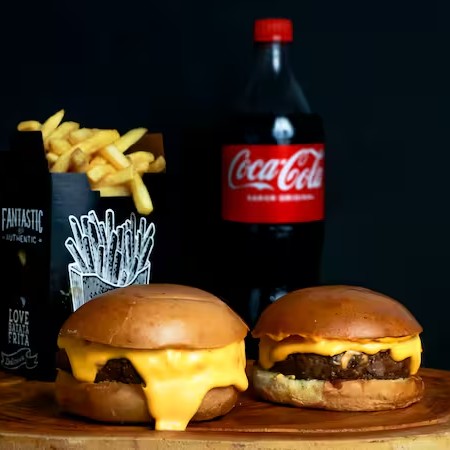 2x Burguer American: Pão selado na manteiga francesa, burger angus de 160g na parilla, american cheese premium.Fritas premium com sal trufado e páprica defumada.1 coca 1l.