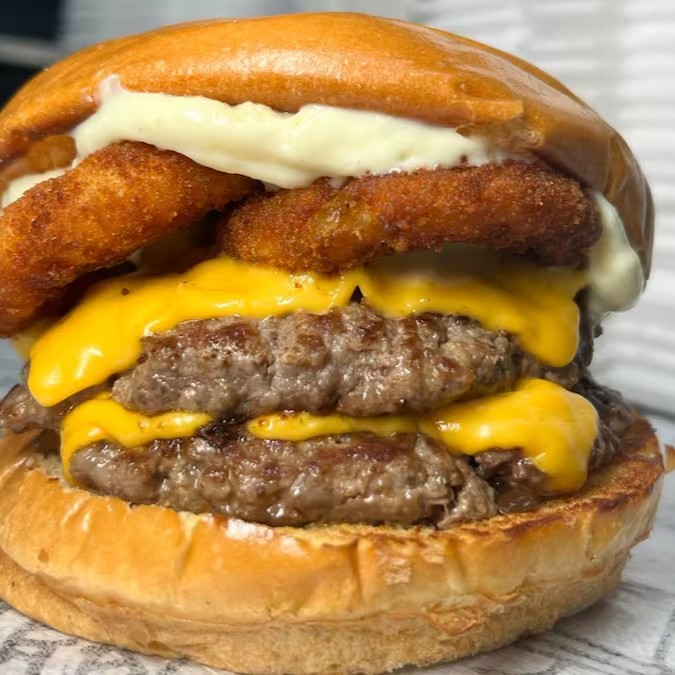 Pão brioche , 2 blend de 90gr , queijo cheddar fatiado , onion rings , barbecue , molho ( maionese caseira )