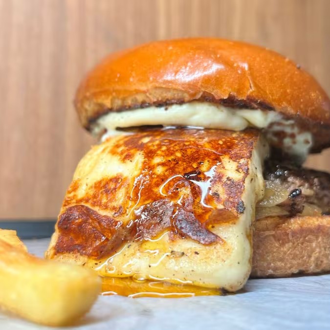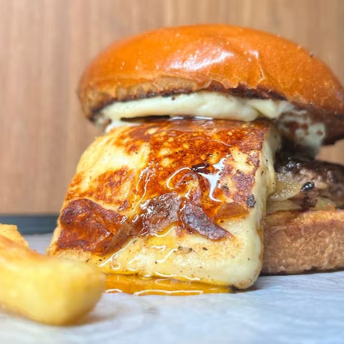 Pão brioche macio , blend 120gr , queijo coalho assado , mel , farofa de bacon , cebola caramelizada e nosso delicioso molho da casa .