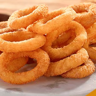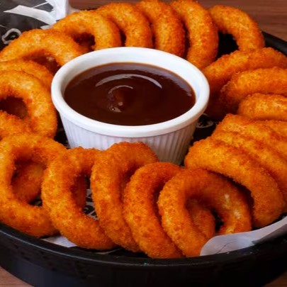 Porção deliciosa de onion rings possuindo 22 unidades.