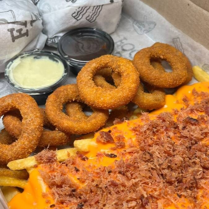 2 Smash Burguers + Batata Com Cheddar E Bacon + Porção De Onion Rings (10 Unidades )