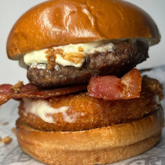 Pão brioche , 2 blends de 120gr , mussarela , bacon , cebola caramelizada , cebola crispy , molho .