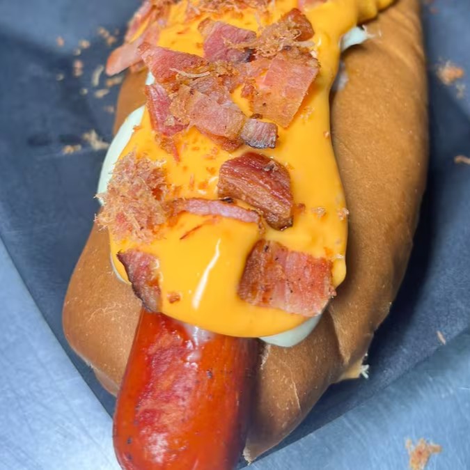Pão de 15cm , chilli (carne moída c/bacon) ,2 salsichas , cheddar cremoso , bacon , molho da casa (maionese caseira ).