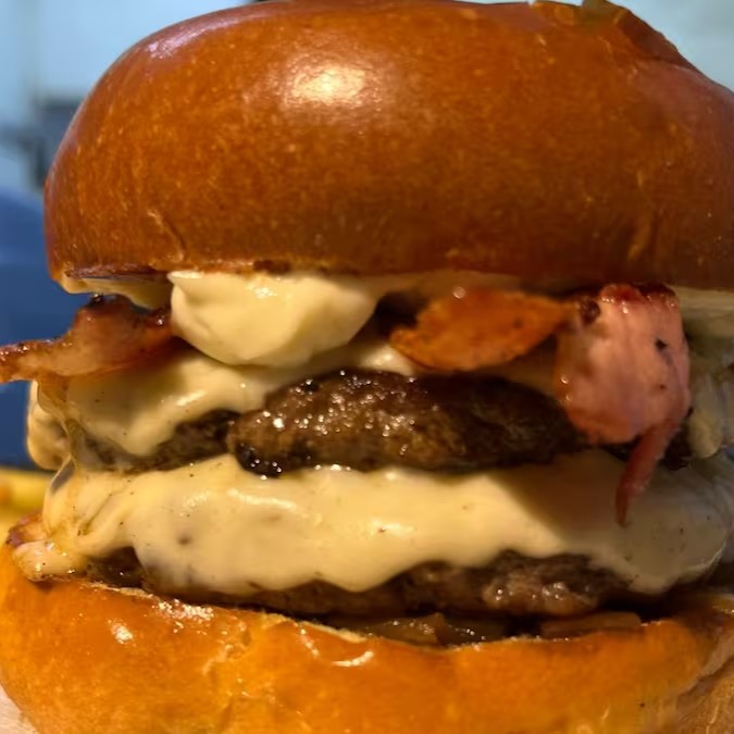Pão , 2 carnes de 120gr , creme de cheddar , bacon , cebola caramelizada , molho (Maionese Caseira ).