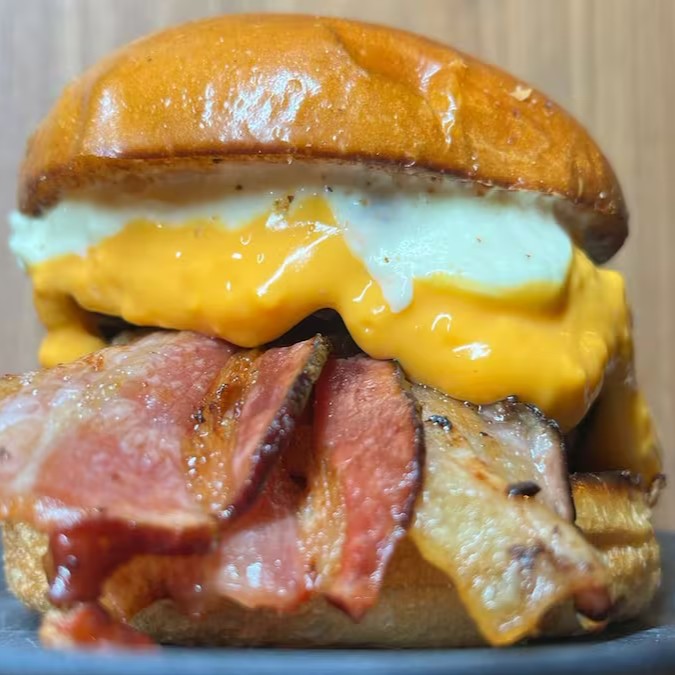 Pão brioche , blend 120gr , piscina de cheddar , farofa de bacon , cebola caramelizada e molho .