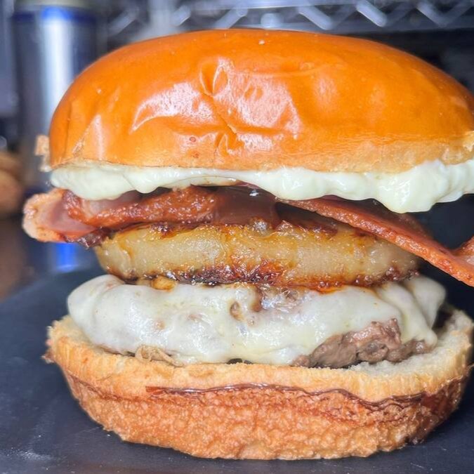 Pão , carne de 120gr, mussarela , abacaxi caramelizado , bacon , cebola roxa , molho e barbecue .