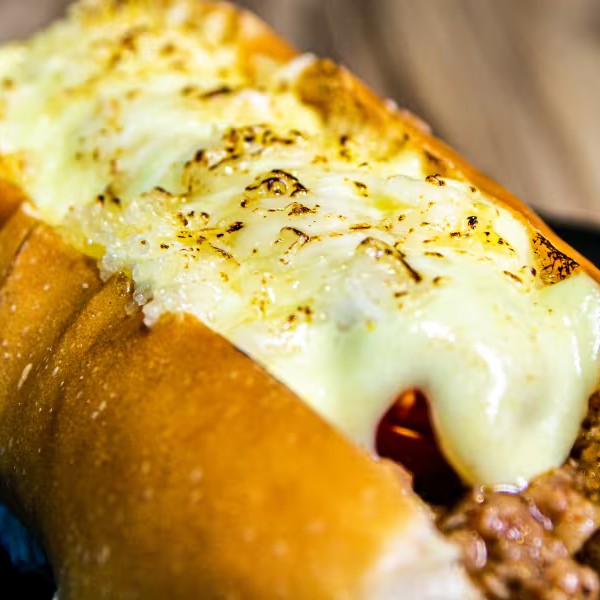 Pão de 15 cm , chilli (carne c/ bacon) ,2 salsichas , mussarela massaricado , cebola crispy , molho da casa (Maionese Caseira ).