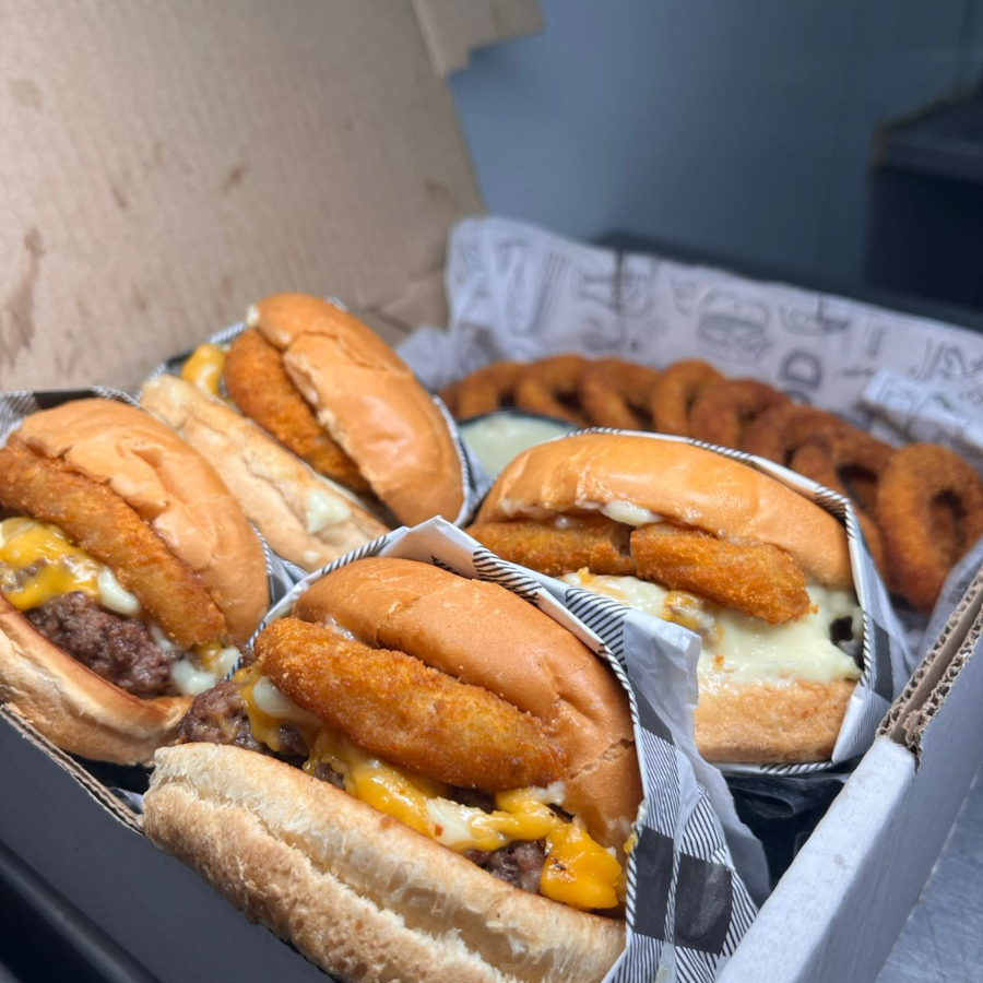 Box perfeito para os amantes de onion rings . Box vai : 4 Burguer onion : 1 blend 90gr , queijo cheddar , onion rings , molho , cebola caramelizada . 1 porção de onion rings , acompanha 2 molhos .