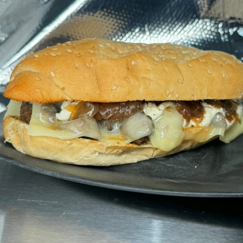 Pão - Carne de fraldinha - queijo mussarela - creme cheese e cebola caramwlizada