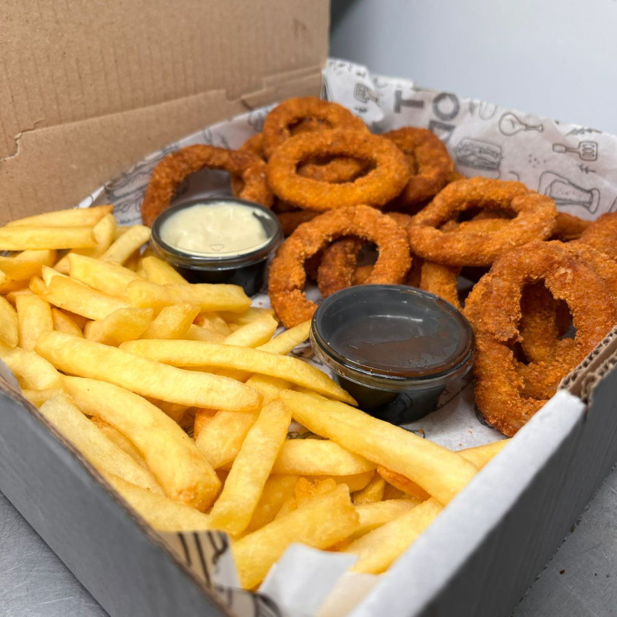 O box perfeito pra quem quer ficar só nas entradinhas . O box vai : 1 porção de batata simples e 1 mega porção de onion rings , acompanha 2 molhos .