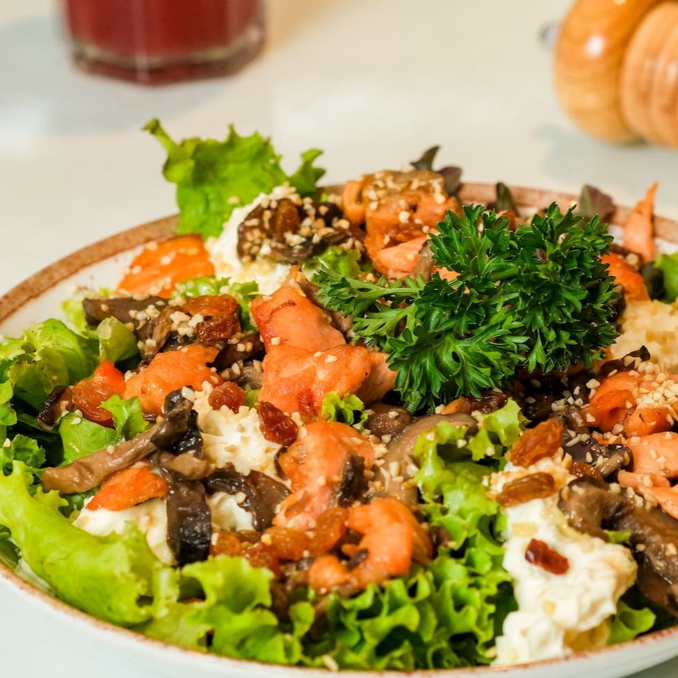 Salmão em cubos, mix de folhas, xerém de castanha de caju, uva passa branca, pasta de ricota temperada com ervas, mix de cogumelos e molho teriyaki.