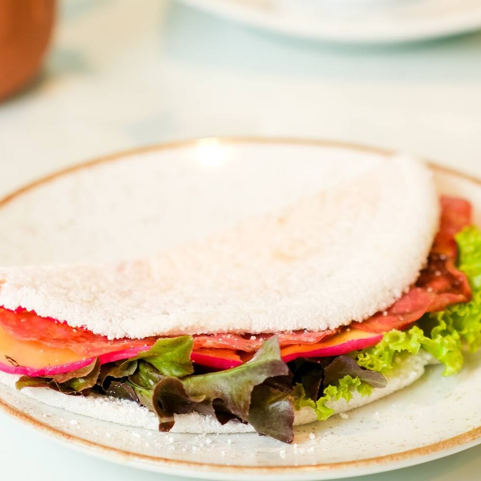 Tapioca recheada com queijo do reino, salame, alface e teriyaki.