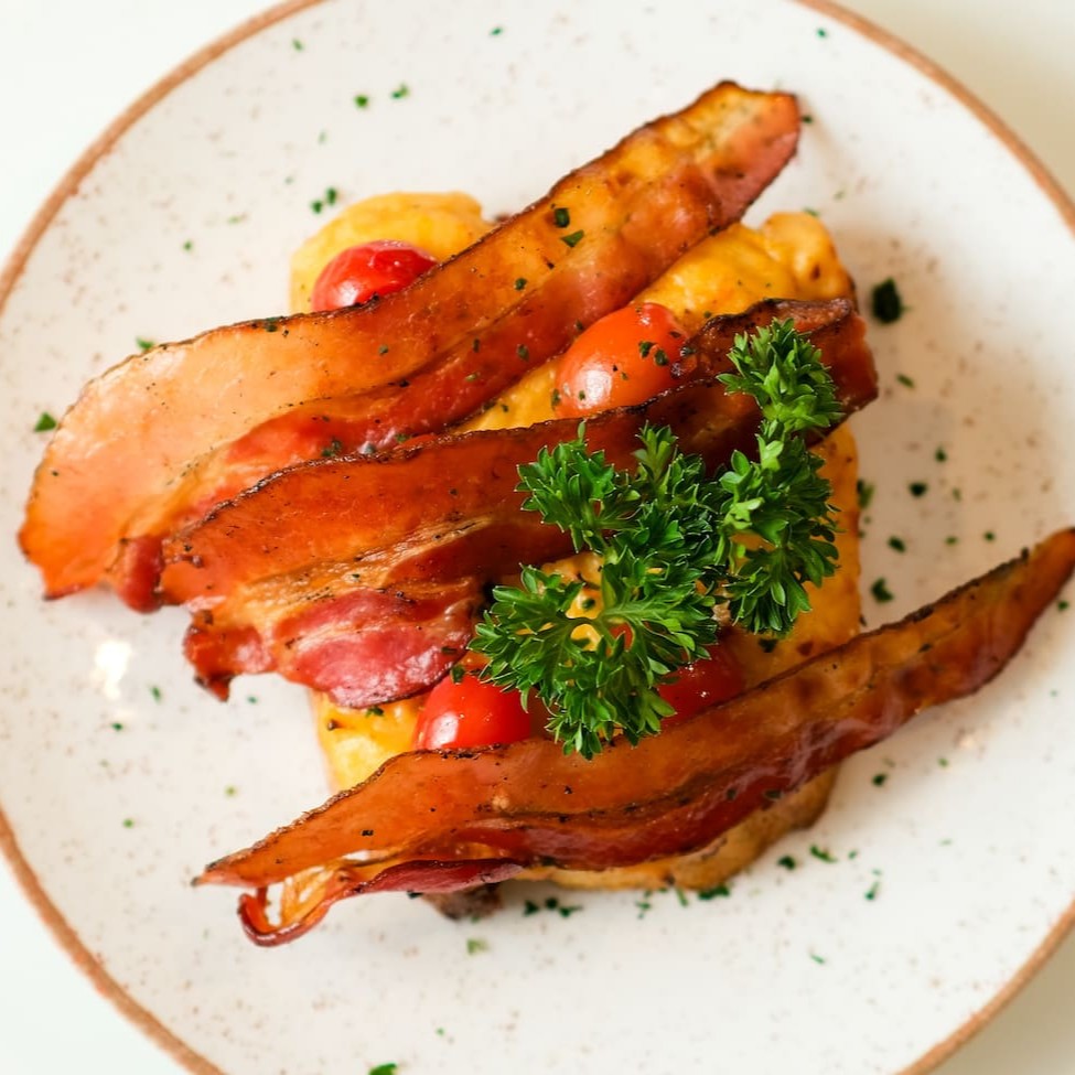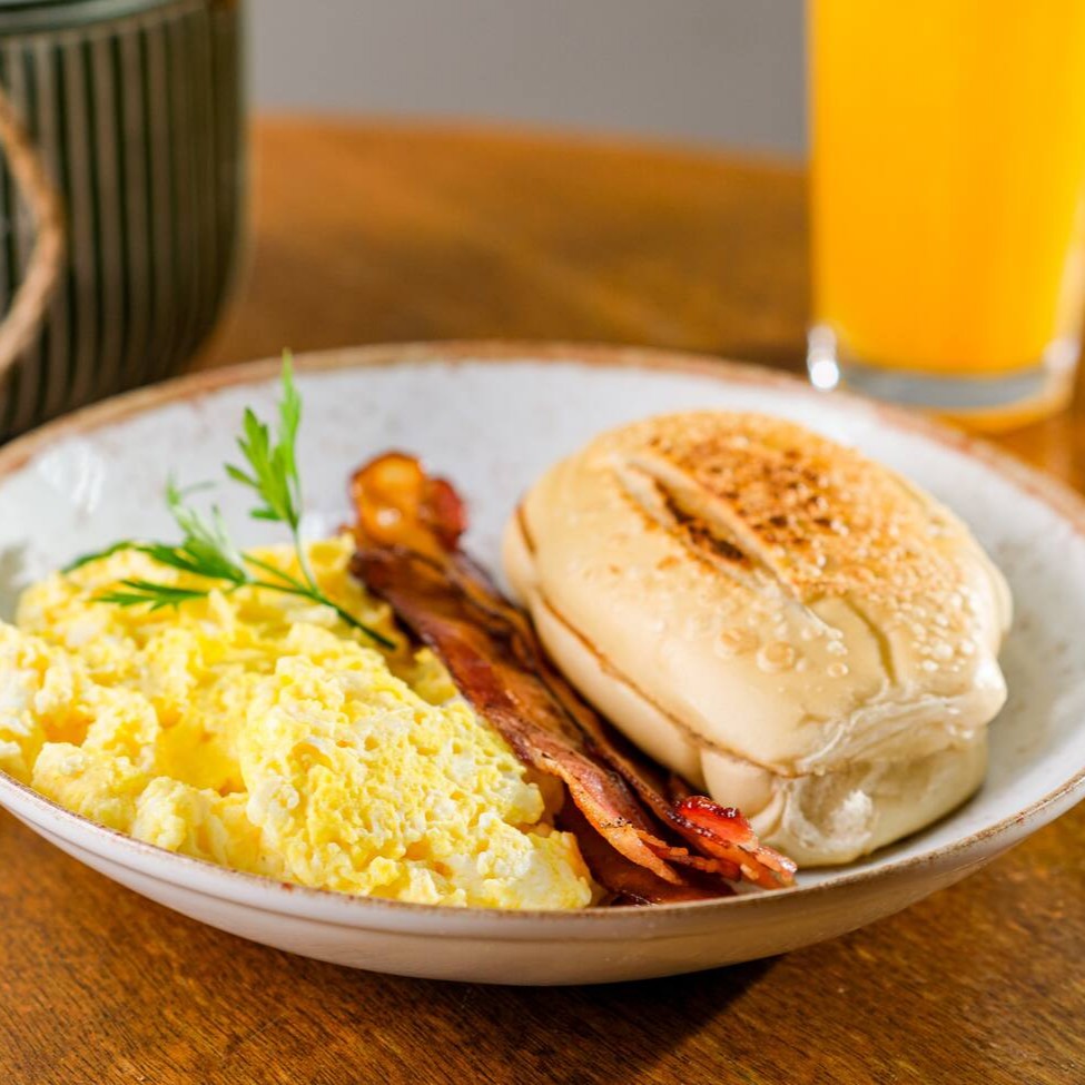 Ovos mexidos cremosos com fatias de bacon e pão francês na chapa.