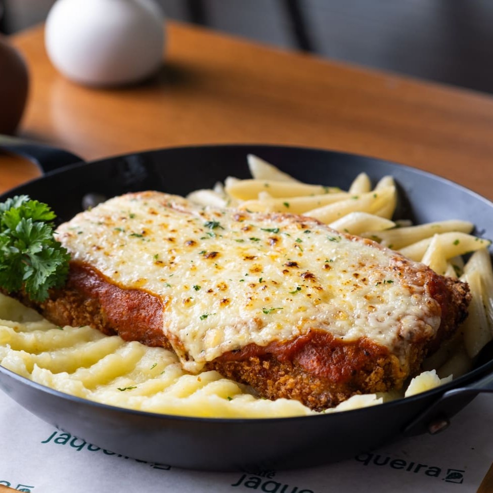 Filé mignon gratinado ao molho pomodoro, penne salteado na manteiga, purê de batata e muçarela.