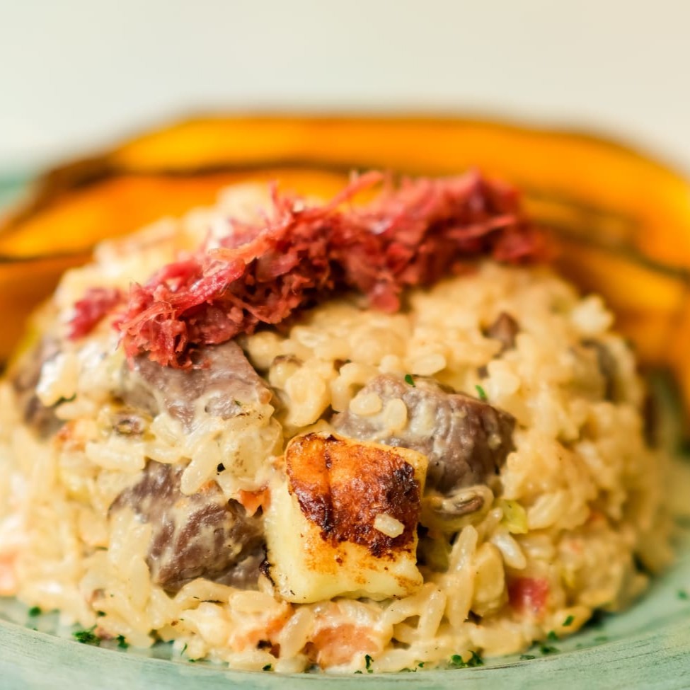 Arroz branco com requeijão cremoso, feijão verde, carne de sol, queijo coalho e bacon. Finalizado com carne seca desfiada e servido com chips de banana da terra.