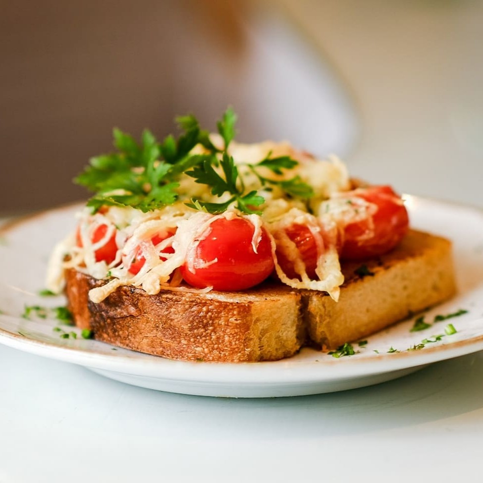 Fatia de pão de fermentação natural, tomate confit, manjericão, queijo parmesão e azeite extra virgem.