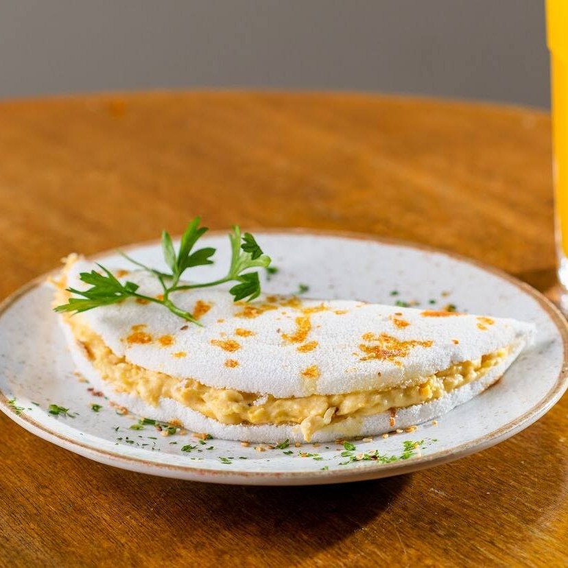 Tapioca recheada com molho de queijo, queijo coalho e frango desfiado.