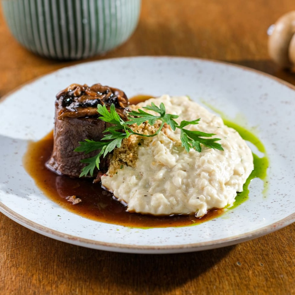 Filé mignon gratinado ao molho escuro de cogumelos com risoto e farofa de pão torrado na manteiga de alho.