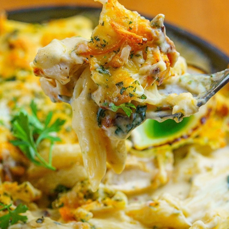 Filé de frango e Penne gratinado, molho de queijo parmesão, bacon, espinafre e cebola caramelizada.