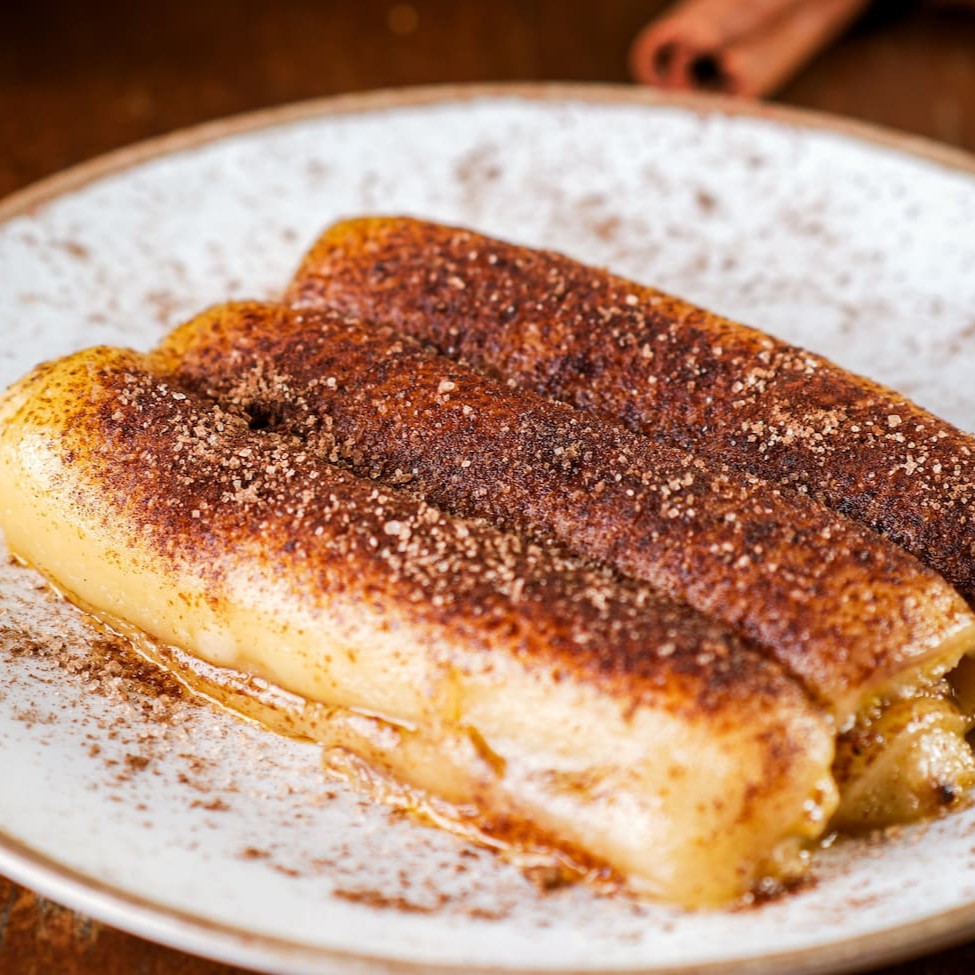 Fatias de banana douradas cobertas com queijo de manteiga assado e polvilhado com açúcar e canela.
