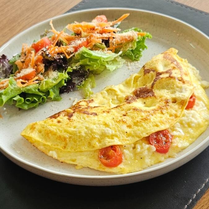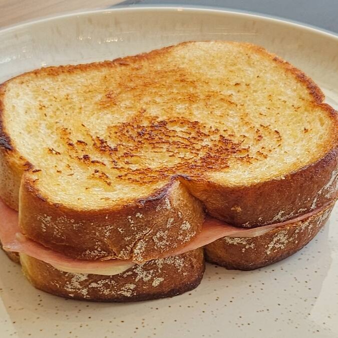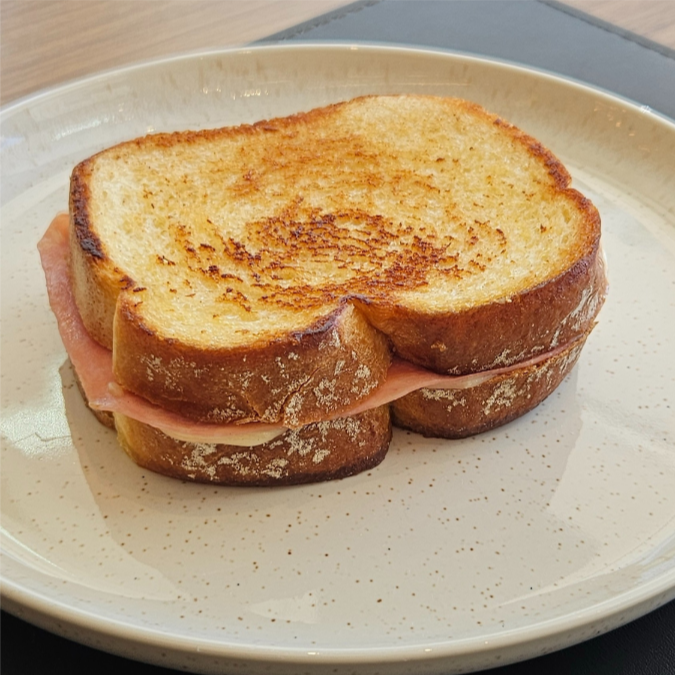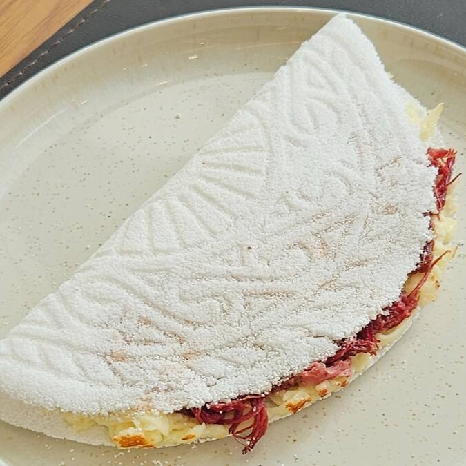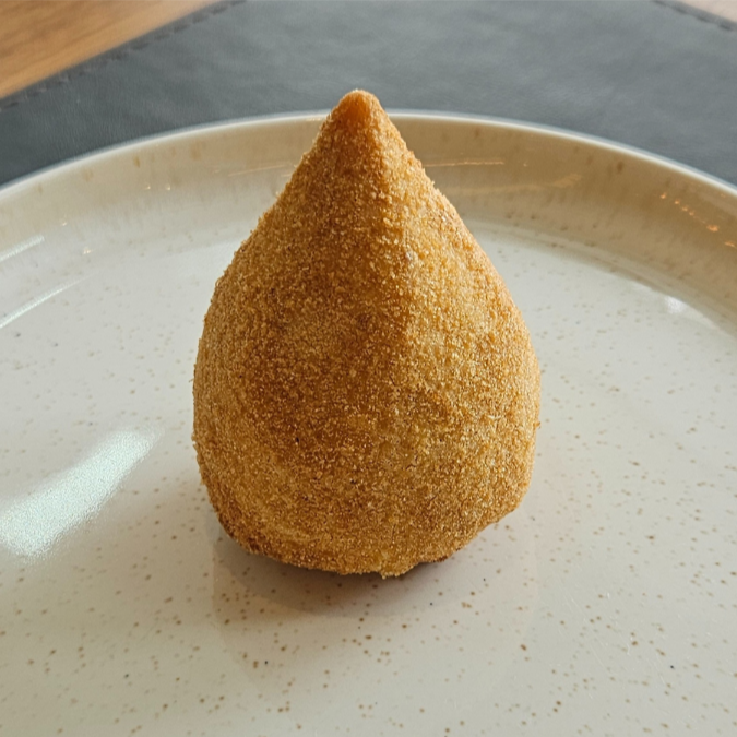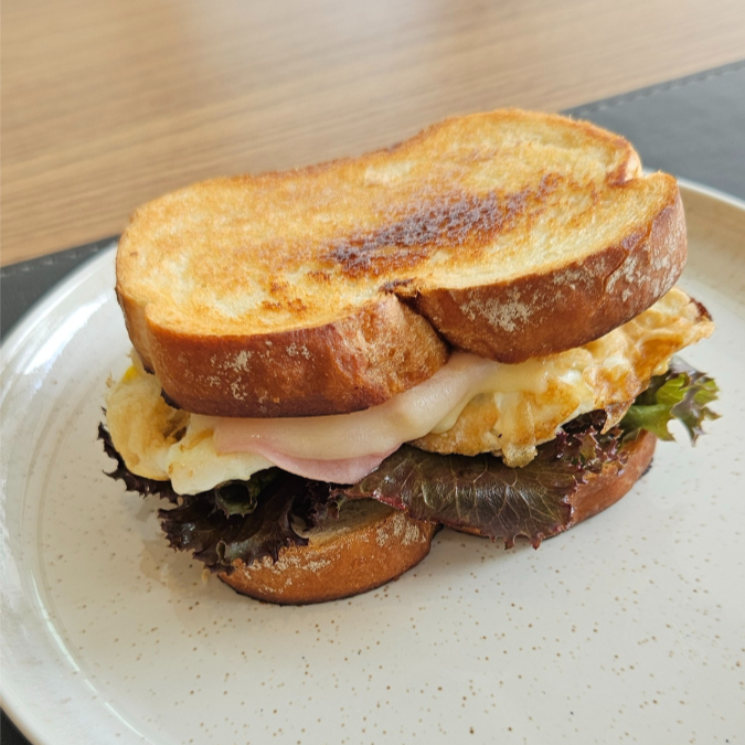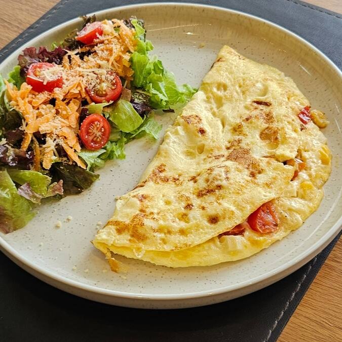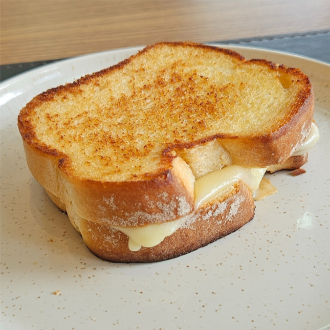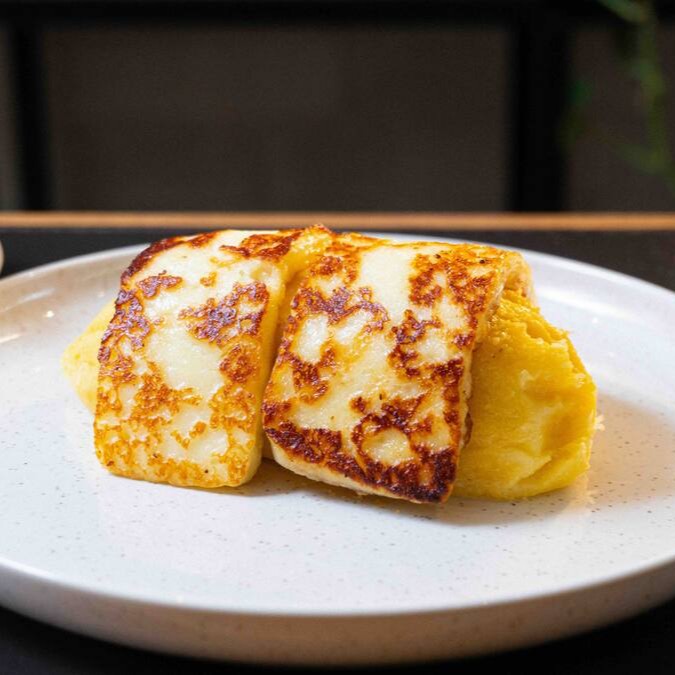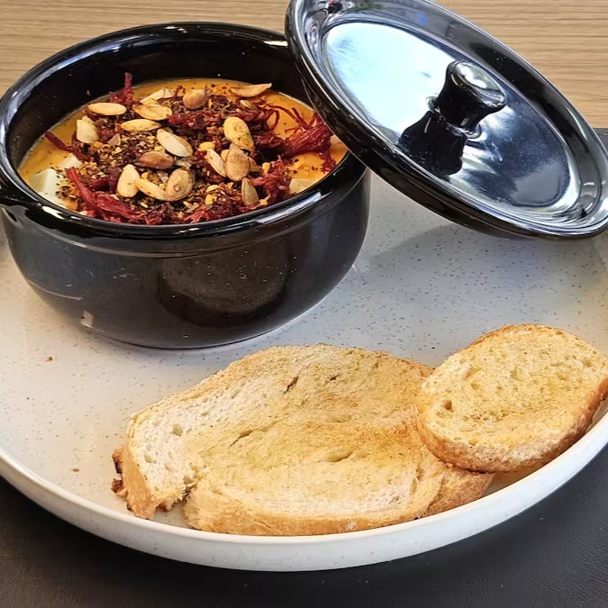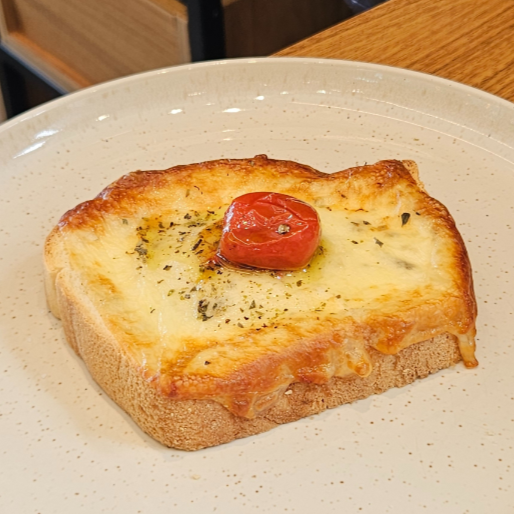 Fatia de Pão artesano recheada com Ovo cremoso e coberto com queijo mussarela gratinado com um toque de oregano. Por cima ainda vai um tomate confit que acrescenta ainda mais sabor.