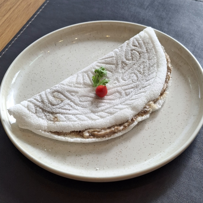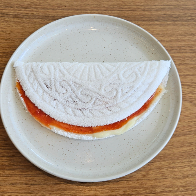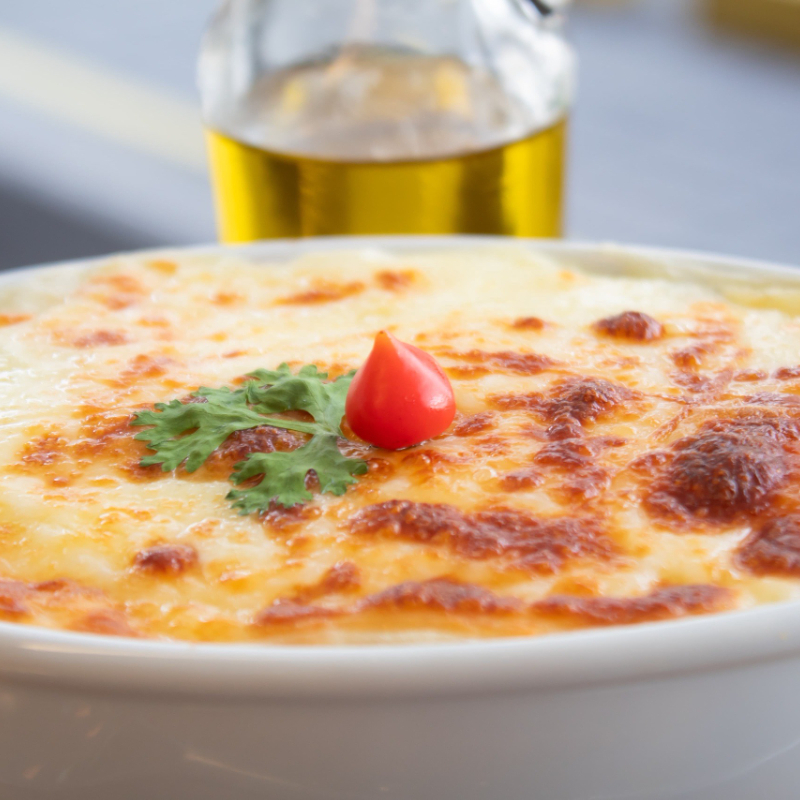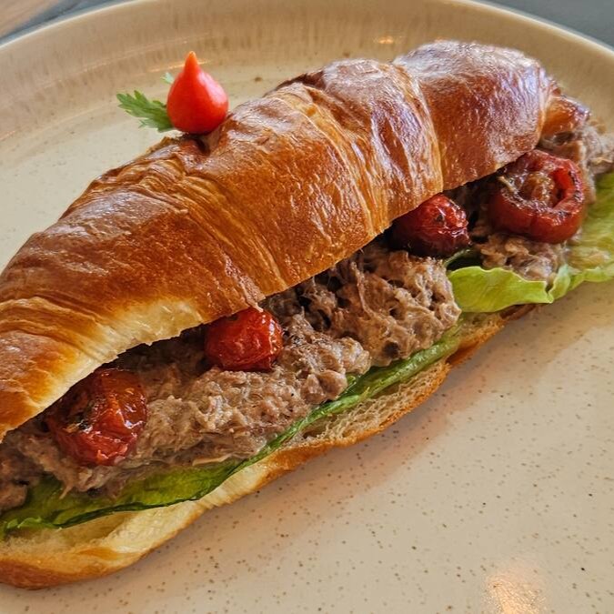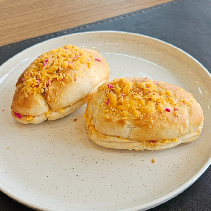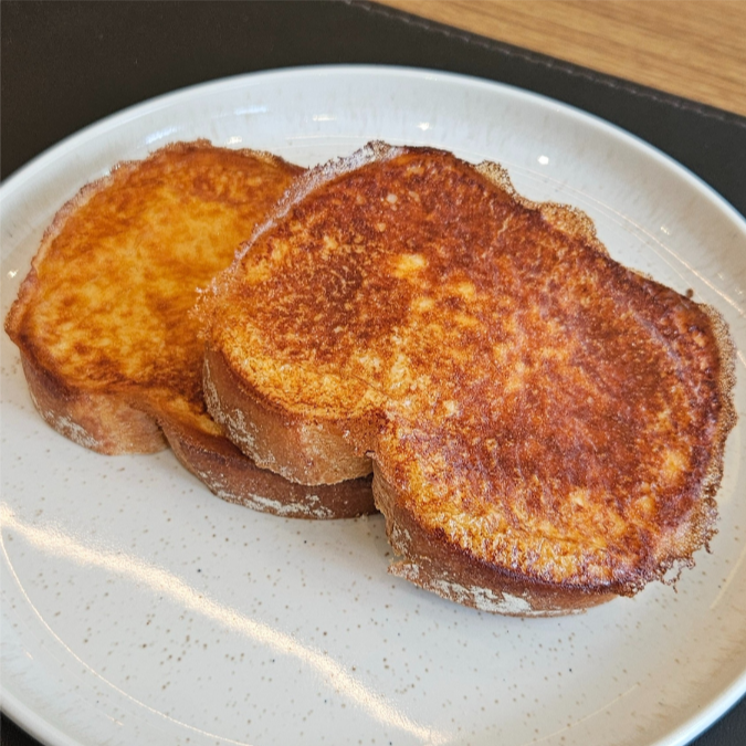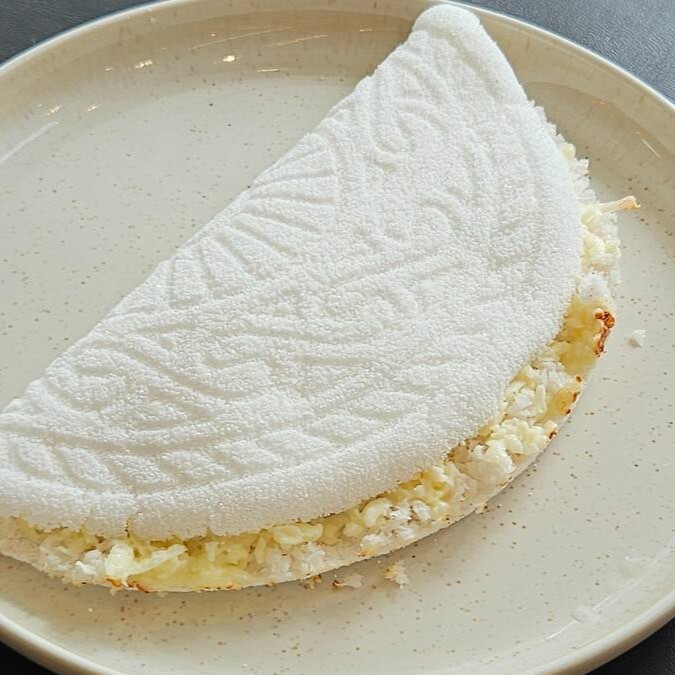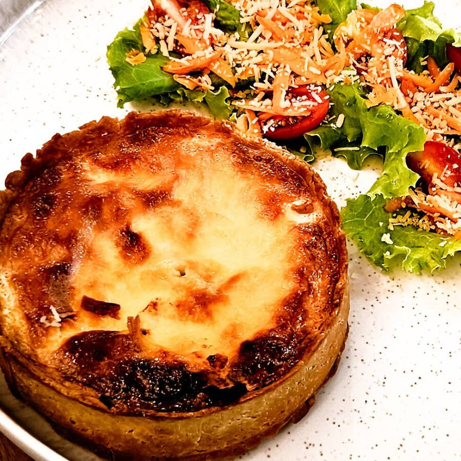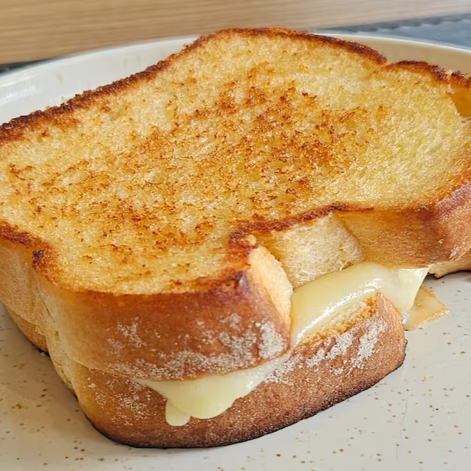 Fatia de Pão artesano recheada com Ovo cremoso e coberto com queijo mussarela gratinado com um toque de oregano. Por cima ainda vai um tomate confit que acrescenta ainda mais sabor.