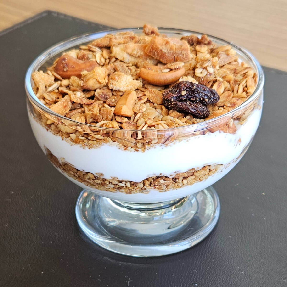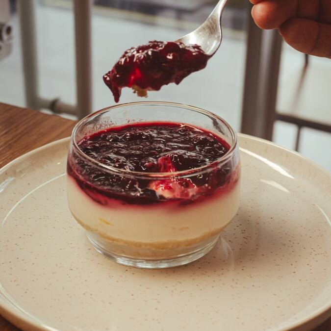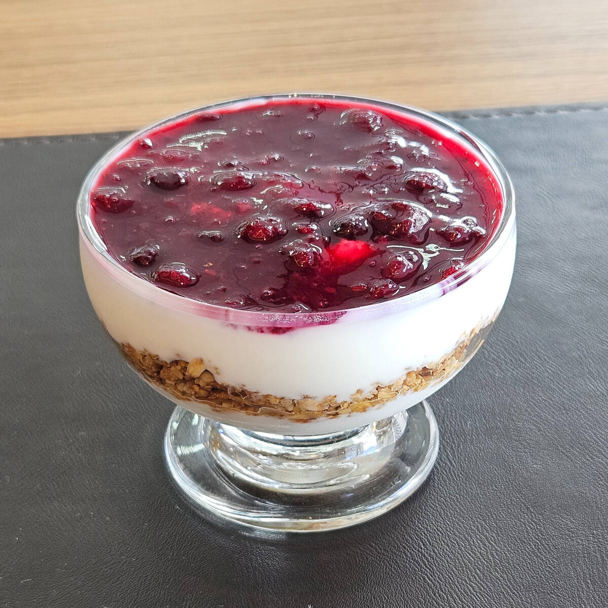 Iogurte natural intercalado com camadas de granola e coberto com geleia de frutas vermelhas artesanal