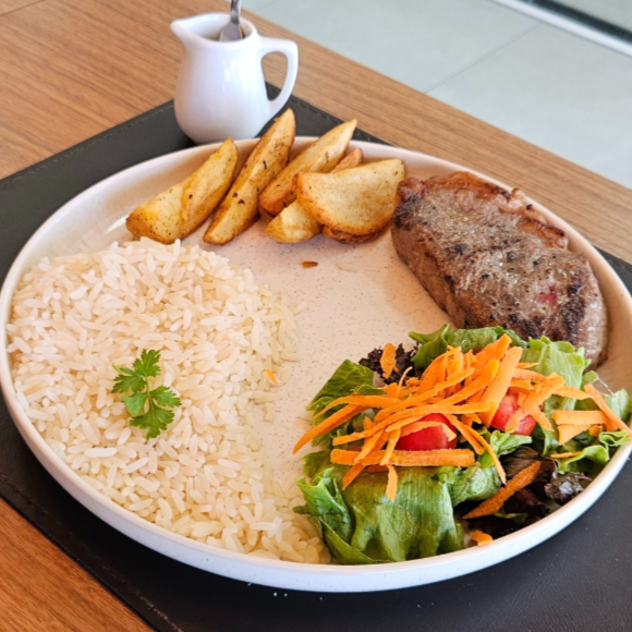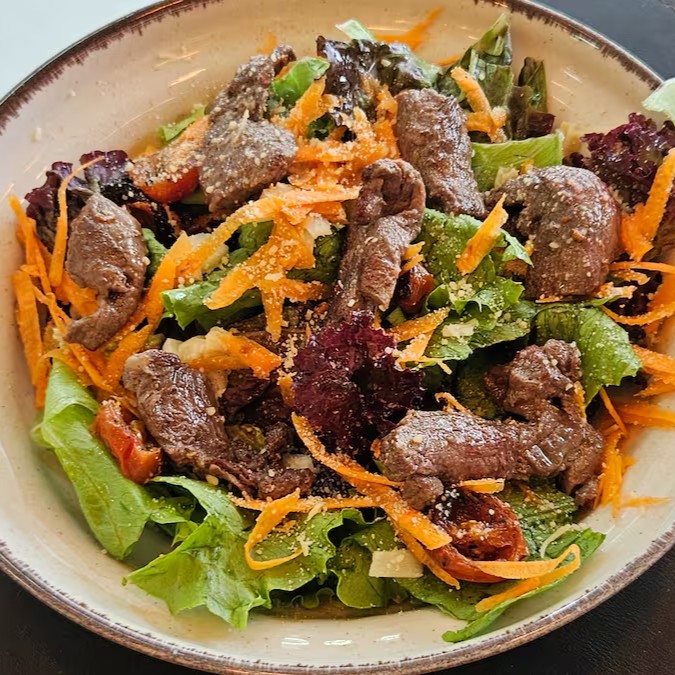 Filé mignon, mix de folhas, tomate confit, lâminas de pepino, palmito, queijo parmesão ralado e molho da casa a parte