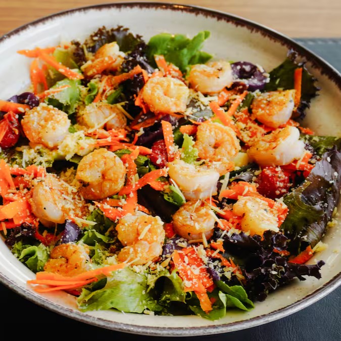 Camarões refogados no azeite, alface, rúcula, cenoura ralada, tomate confit e molho da casa a parte. Finalizada com azeitonas pretas