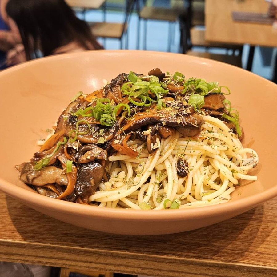 Espaguete ao Alho e Óleo com um toque de ervas finas. Acompanhado com um mix de cogumelos ao molho teriyaki frutado da casa R$ 42,90